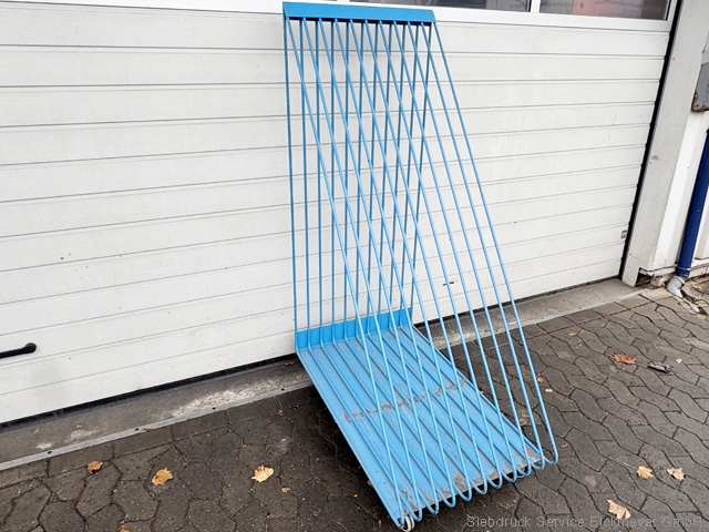 geeignet zum Einstellen von 10 Stück Siebrahmen bis zur max. Größe 140 x 180 cm, Stahlrohrkonstruktion, hellblau gepulvert, Außenmaß: ca. 105 cm tief x 62 cm breit x 160 cm hoch, fahrbare Ausführung, gebraucht.