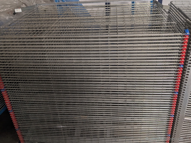 50shelves, useable size: 60x90cm, with red plastic space bumpers, galvanised rods with galvanised mesh, support with casters, used, medium condition