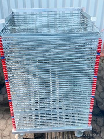 50shelves, useable size: 60x90cm, with red plastic space bumpers, galvanised rods with galvanised mesh, support with casters, used, medium condition